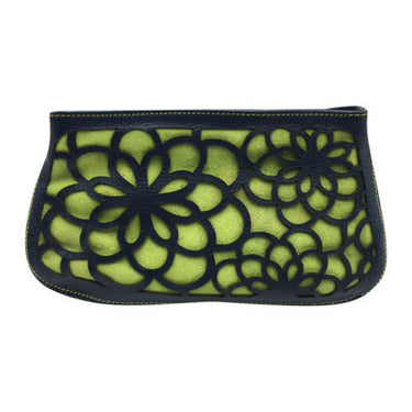 The Seaside clutch is a custom designed small clutch you can wear anywhere, anytime, with anything. With a two finger slide on the bottom, this clutch allows for a good grip and a snap top closure.  It is made of a green suede and navy leather.