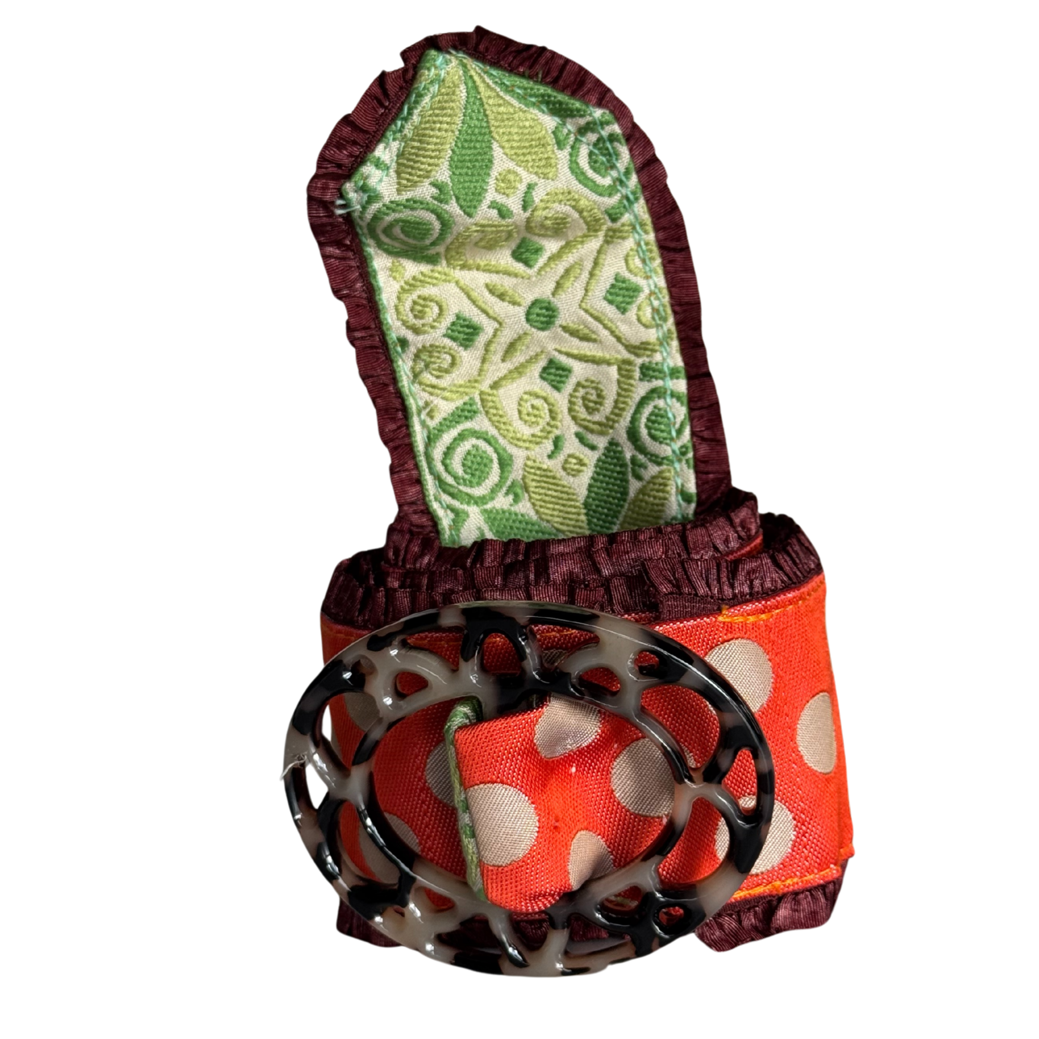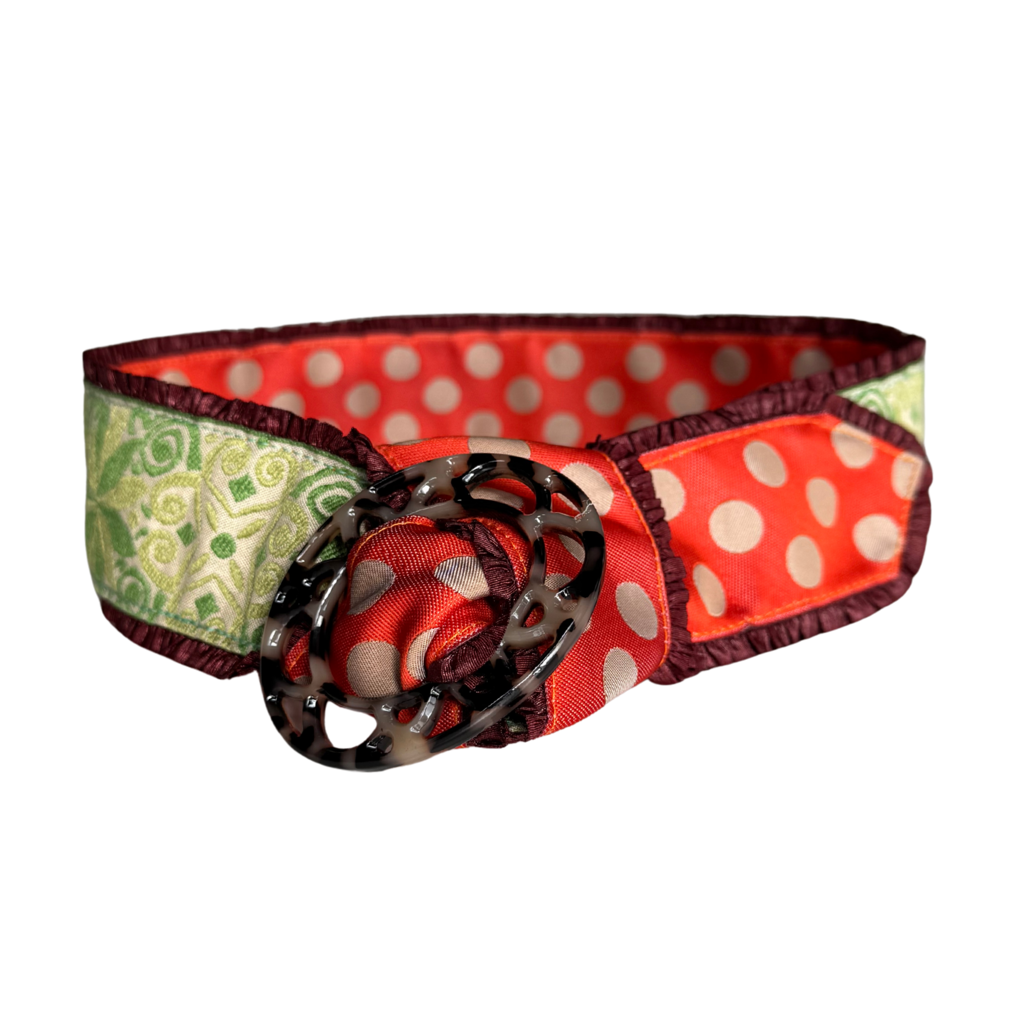 Description: Meet the Hadley Pollet Crimson TwinkleDot Belt — your new favorite statement piece that flips with your mood. One side dances in playful polka dots, the other sparkles with starry charm, and ruffled edges add a touch of whimsy to every outfit. Designed for women who love versatility and joy, this reversible belt is perfect for elevating casual looks or adding flair to special occasions.