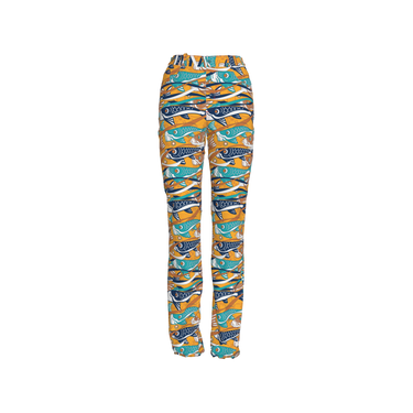 The design showcases a playful pattern of fish in shades of caramel, teal, white, and black, arranged in various orientations to create a sense of flow and energy. The pants are fitted at the waist and hips with a straight-leg cut that offers both comfort and a flattering silhouette. A comfortable waistband ensures ease of wear, making these pants perfect for creative outings, casual gatherings, or making a statement wherever you go.