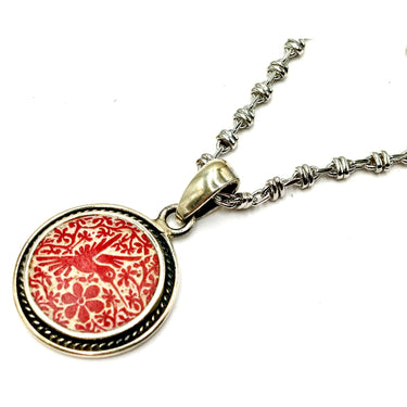 Lovely hummingbird scene carved and handprinted by artisans in Peru for Hadley Pollet. Laid in sterling silver and accompanied by a gorgeous chain.