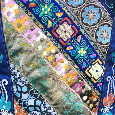 This jacket has the essence of color, fun and spirit with a patchwork of Hadley's copyrighted trims on the back. sleeves and even a little one on the inside of the buttons. Slip it on and your outfit is all tied together.