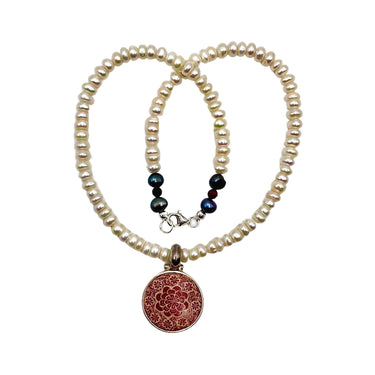Hadley Pollet Pearl and Sterling Necklace with Hand Carved Zinnia Charm