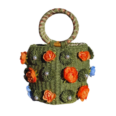Green Straw Bag with Pearls and Flowers